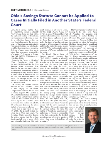 The Ohio Supreme Court reversed, looking to the Ohio Civil Rules of Procedure for guidance and expanding its earlier holding in Howard. The court referenced its reasoning in Howard, holding that the rules did not intend for “an action led in a foreign state be considered “commencement” or “attempted commencement” for purposes of applying Ohio procedural law.” In so nding, the court reasoned that Civ.R. 3(A) de nes “commencement” as “(1) ling a complaint with the court and (2) obtaining service within one