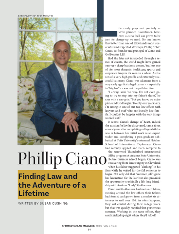 just the change-up we need. No one knows this better than one of Cleveland’s most suc- cessful and respected attorneys, Phillip “Phil” Ciano, co-founder and principal of Ciano and Goldwasser LLP.