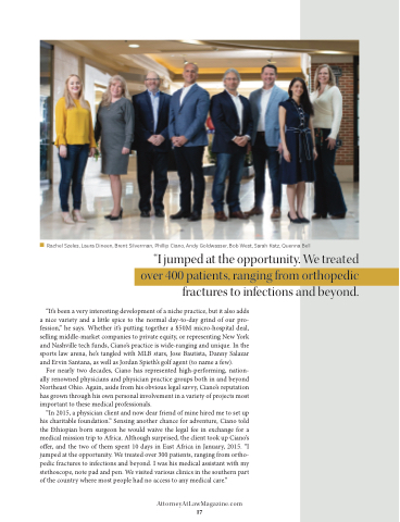 “In 2015, a physician client and now dear friend of mine hired me to set up his charitable foundation.” Sensing another chance for adventure, Ciano told the Ethiopian born surgeon he would waive the legal fee in exchange for a medical mission trip to Africa. Although surprised, the client took up Ciano’s o er, and the two of them spent 10 days in East Africa in January, 2015. “I jumped at the opportunity. We treated over 300 patients, ranging from ortho- pedic fractures to infections and beyond. I was his medical assistant with my stethoscope, note pad and pen. We visited various clinics in the southern part of the country where most people had no access to any medical care.”
