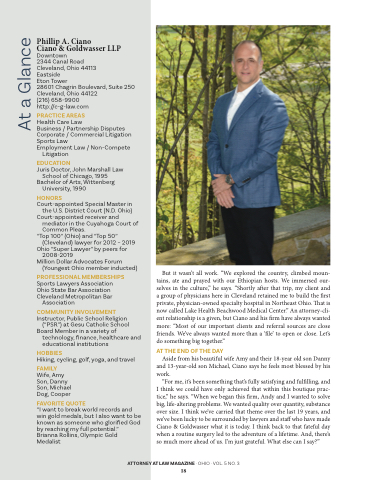 But it wasn’t all work. “We explored the country, climbed moun- tains, ate and prayed with our Ethiopian hosts. We immersed our- selves in the culture,” he says. “Shortly a er that trip, my client and a group of physicians here in Cleveland retained me to build the rst private, physician-owned specialty hospital in Northeast Ohio. at is now called Lake Health Beachwood Medical Center.” An attorney-cli- ent relationship is a given, but Ciano and his rm have always wanted more: “Most of our important clients and referral sources are close friends. We’ve always wanted more than a ‘ le’ to open or close. Let’s do something big together.”