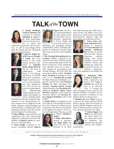 e Cleveland Metropolitan Bar As- sociation (CMBA) is pleased to an- nounce its new slate of o cers and di- rectors unanimously approved by the Board of Directors. ese individuals were o cially sworn in on June 7, 2019 during the Association’s 12th Annual Meeting. e 2019-2020 Bar Association o cers will be: President Ian N. Friedman (Friedman & Nem- ecek, L.L.C.); President-Elect Joseph N. Gross (Benesch, Friedlander, Co- plan & Arono LLP); Vice President Rosalina M. Fini (Cleveland Me- troparks); Treasurer Ann M. Caresani (BakerHostetler); Vice President of Di- versity & Inclusion Valissa Turner Howard (Cuyahoga County Inspector General’s O ce); and Secretary Re- becca Ruppert McMahon (CEO of the CMBA).