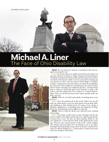 Liner: For me law school, in reality, was the rst job I had as an associate attorney working at Nager, Romaine & Schneiberg in Cleveland. I learned a lot more in that job than I did in law school. I worked at the rm for a little over two years before starting my own practice in 2013, and my mentor David Nager (a fantastic workers’ compensation attorney) knew very little about disability law. However, Dave taught me everything my law school classes did not about running a successful law practice. I learned from him to value my clients like gold, work tirelessly to make a le perfect, and how important it is to respect co-counsel relation- ships. ese are all lessons from Dave which quickly made my rm a success.